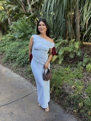 I felt like Charlie’s Angels Lucy Liu circa 2000 in this dress. The two-piece silhouette, asymmetrical neckline and blue/merlot color combo made it incredibly unique and elevated, yet still effortlessly cool. An added bonus is how versatile the adjustable ties make the dress - you can either tighten them for the two-piece cut-out look, or loosen them to wear the dress fully closed. 12/10.