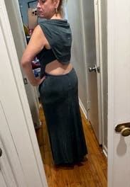 Since there are no reviews I’m posting my try on pics. This dress is a stretchy and true to color in the photos. The back is stunning especially if you have a booty to show off. You can wear a regular bra but I struggled with panties a bit but figured it out by wearing some backwards. Weird ikr? The front covered my tummy well and I don’t feel like I’ll need to wear shapewear. It’s also comfortable! The LP was perfect, not too long on my 5’3 self. This is such an intriguing and interesting dress I can’t wait to wear it!