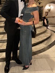 Great dress for black tie gala. Soft, stretchy material with ruching that helps with midsection even after dinner and drinks. Comfortable for dancing. Dress caught on my 3” heels occasionally, but long length meant beautiful draping