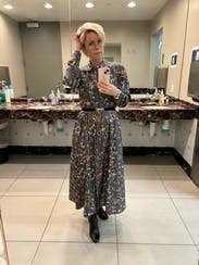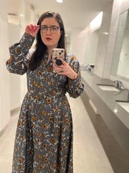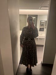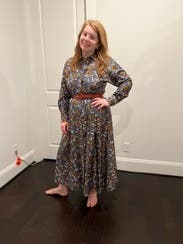 This definitely runs large; I’m almost 6 months pregnant, typically a size 16, and the 14 fit perfectly, with enough room in the skirt to easily wear it to full term. I did have to finagle the top, since it’s not an empire waist, but it still worked! It’s a big dress - voluminous and very long skirt, I can definitely see how it could overwhelm. At 5’5”, I absolutely needed heels. But styled with heeled tall boots?? Ugh, so chic. I got endless compliments. Also, the background is actually a navy blue, but it does read grey from a distance. The blue made it easier for me to style and was more flattering. TB dresses are such high quality and this is no exception - this was a thick, silky material, well stitched/substantial cuffs and collar, and interestingly, snap buttons! If I wasn’t pregnant, I would probably want a belt of some sort, for more definition and to break up the pattern. I will rent again and will probably buy.
