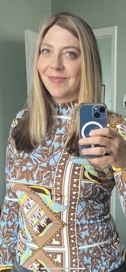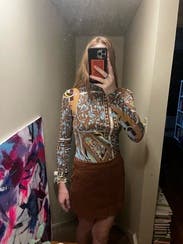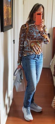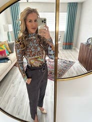 I usually stay away from colors and patterns but decided to change things up - this was a fun top that worked nicely with black pants. Could absolutely be dressed up or down. One thing I didn’t realize was the sleeves were a little puffy - I could have done without that.