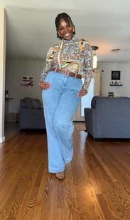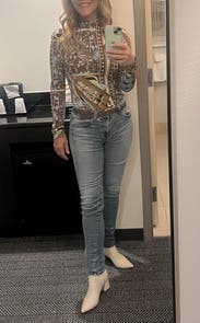 Loved the look of this top and the slinky material. I’ve always considered my neck to be on the longer and slender side of necks, but I couldn’t zip this shirt all the way or it choked me. Loved the 70s vibe and just let my hair cover the open top of the zipper. Hugged my belly pooch more than I’d like, but a pooch draped in this fabric is better than a pooch draped in something boring. Win!
