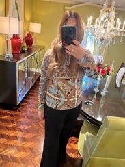 Love this print. Great colors, so versatile. Great for work and fun. Light weight but not sheer. Lots of complements.