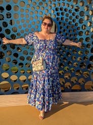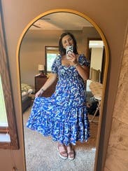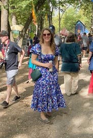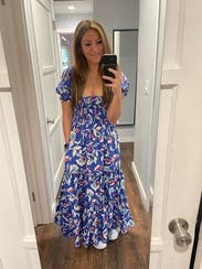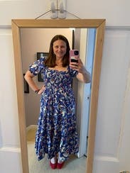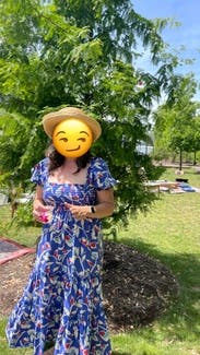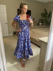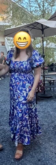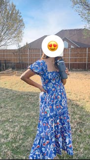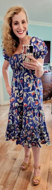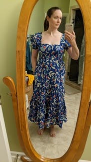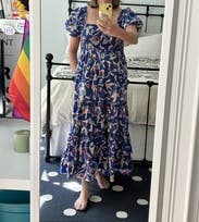 The dress is so cute! I love the print! A random person stopped me in the restaurant parking lot when I wore it on Mother’s Day to ask where I got it. It is lightweight but won’t blow up at a gust of wind so good for spring. Very comfy plus pockets! It did have a tendency to creep down in the chest as I wore it so I kept having to pull up/adjust it which is my only complaint. (That and the strapless bra requirement.) I would definitely rent it again for photos or for a luncheon/event where I plan to mostly sit.