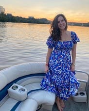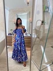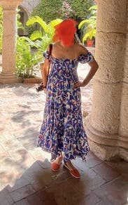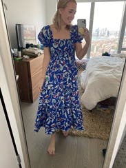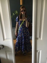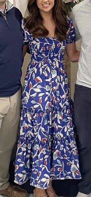I love, love, love this dress! A big part of that is because it's the same dress worn by Catherine, the Duchess of Cambridge, and I have a weird fascination with the royal family. :) But this dress is also super comfortable and I was able to wear a size small, when I normally wear a medium or large (I'm between an 8 and a 10). The small fit perfectly, though I think a medium might fit me better in the chest as the dress would creep down as I walked showing the top of my bra cup. I was able to wear a regular bra with it, but I could also wear a strapless and do an off-the-shoulder look. Plus, it has pockets. The print is vibrant and the material is a medium weight, light enough for summer but with some substance. I'll be renting again!