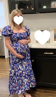 I rented this for our baby's baptism. Not only is it nursing friendly, the top portion is the perfect amount of stretchy, but it was also so comfortable. I loved the pop of color and the length. I'm really tall (over 6ft) and felt like it hit perfectly around my calf. There is a slight hint of yellow in the pattern that was unexpected but still looked great. Would recommend!!