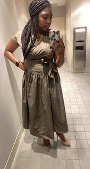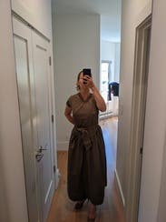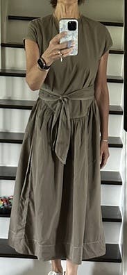 Apologies for not steaming before wearing. The dress arrived brand new and I was in a hurry. Pros Wrap style is easy to personalize the fit. The contrast stitching is on trend. Pockets are deep and well placed. The material is crisp and comfortable. Neutral Length is maxi. Brand sizing runs large, I'm usually a 4 with a D-cup and I wear a size 2 in this brand - consider ordering down. Con The yolk styling at the waistline spotlights bloat.
