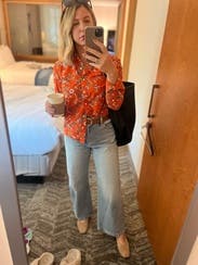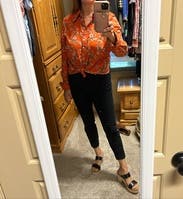 I wasn't sure I was going to end up wearing this. It is really stiff and had this formal country vibe going on, imo. But I paired it with some high waisted ankle length jeans , a pair of flats and tied the shirt in the front and I actually really liked the look (casual Friday). The orange is really pretty.