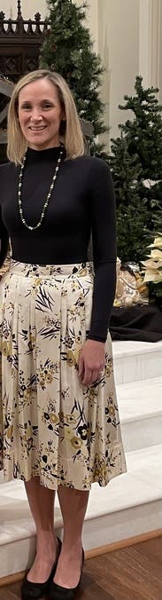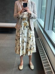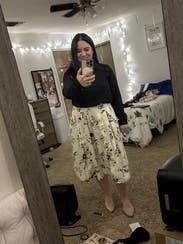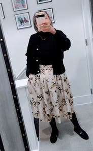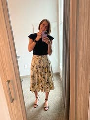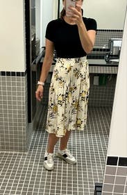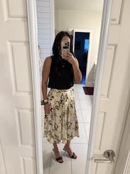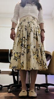 This skirt was so pretty and I loved wearing this to work and church. Fit was TTS, waist has no stretch so at times I felt a little self-conscious about my pooch showing but was able to camouflage it with the top. Skirt wasn't see-through at all but definitely a lot of static that increased throughout the day.