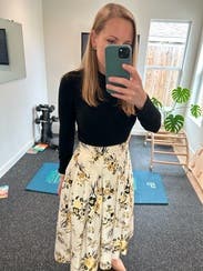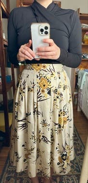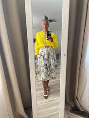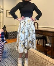 This skirt was beautiful and paired well with may different tops. For me it has a bit too much volume and a bit too high waisted. This is probably because I am a shorties. Will rent again