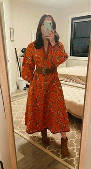 I wore this with a belt to give it more of a tailored fit. The color is pretty orange, not red. Lots of compliments.
