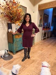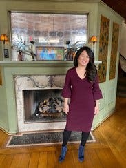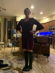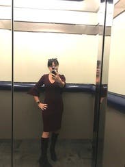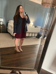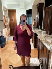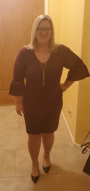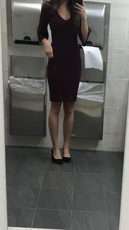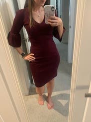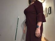 Feminine form-fitting dress, breathable fabric; pretty sleeves; could have been worn for a date night or from work to dinner. Wore it to work; wish I’d snapped a pic! Very pretty Fall burgundy/wine color