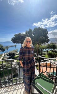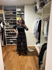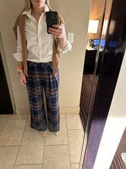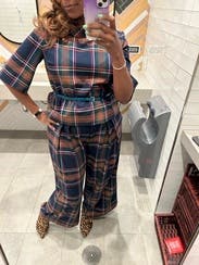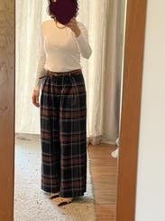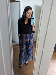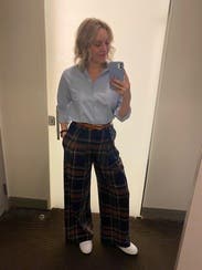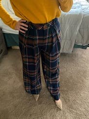Loved these. They are very wide leg which felt new and on trend. The plaid was great (it’s navy based). They ran slightly big in the waist, but still fit well. Rent this if you want a high impact work or dinner outfit