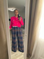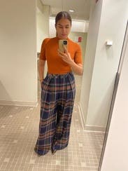 With a button down, a sweater or a simple tee, these pants will make you look stunning. Endless compliments. They’re meant to look oversized which normally don’t look good on me, but the pattern helps. It’s more colorful than it appears with an orange and magenta stripe in it. Perfect length for me in flats and I’m 5’ 9. Most likely will buy. Wore this during summer but would be amazing fall or winter look with a trench. They’re so classic but SOOO fun!