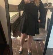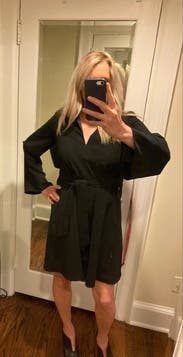 Loved this one. Simple black dress but the tie belt gives it some sass. It runs a bit short.