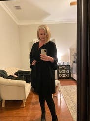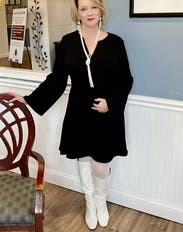 Really cute tie front dress, could be dressed up or down, but sleeves too long for me as I’m short armed, and bell sleeve couldn’t be pushed up higher. If sleeves had fit I might have purchased. Material is nice for cooler weather.