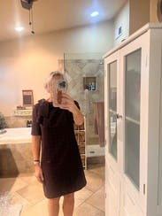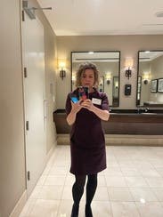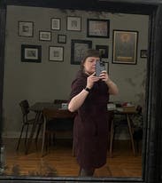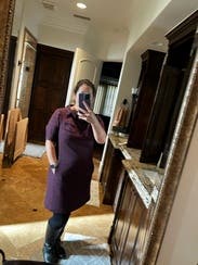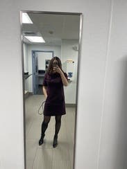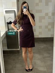 You can see in the pic how the pockets are kind of weird on this, but it's fine. Still wore it and felt cute. I have a little post-partum belly and this was still flattering. I rented this for work but also ended up wearing to a holiday party. I usually wear a 4, 6 or 8 depending on the brand/style. I got an 8 in this and was glad for the length and it fit well everywhere else, so I'd recommend going with you larger size if you're in between.
