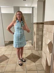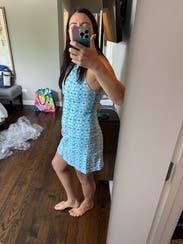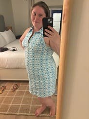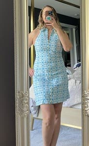 This dress was great - structured fit with a little stretch. Snug around bust area but not tight. Great color, length and material. Wore with flip flops and with white wedges to dress up a little. I wore this dress everywhere - mostly for casual attire. It has a preppy feel - golf attire. Debated buying it but it is t makes down that much so I’ll take my chances with renting again! Sadly no good photos of the full dress….