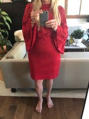 Beautiful dress, true to size. Very high quality lacework and gorgeous bell sleeves. For me I chose not to wear because I was too self conscious of my mid section. I don't usually wear sheath dresses but I fell in love with the sleeves, fabric and color and thought I would give it a try, that's the fun of RTR to get out of your comfort zone at least a little right?