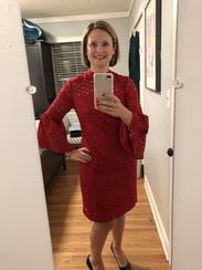 Love this dress! I wore it for a Valentine's Day date night with the hubs. Very easy to wear and comfy but elegant. Love the lace overlay. Highly recommend. I rented the earrings as well.