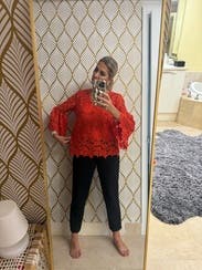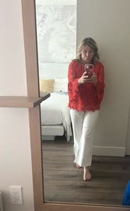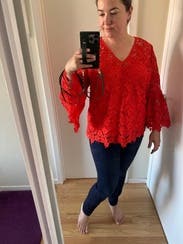 Beautiful lace and great vibrant color but really not my style. Fit very boxy but no way I could have sized down due to fit in my chest area. Felt a little old fashioned like something my Grandma would wear.