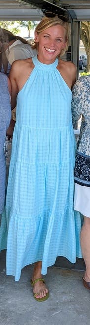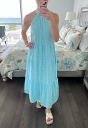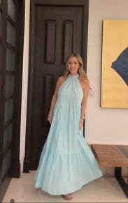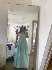 I wore this to a rehearsal dinner and was so comfy all evening. Beautiful blue hue, good lining, great length. I liked the high neck bc it gave a new spin on a traditional maxi dress. Can easily be dressed up w heels or down with sandals. Would be great for anyone expecting bc the maxi gives you plenty of space for a bump moment. Love it.