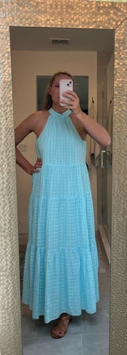 Loved this dress so much I bought it! The fit was great, it’s supposed to be flowy. It was a little loose on the sides and the gapping on my chest made me nervous so I tacked it at the side seam. The hooks on the neck are also hard to to on your own. Overall though, I loved the color, the material is perfect, and the length is ideal. It’s the perfect casual summer dress.