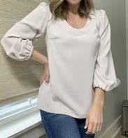 Thick fabric, lays nice, must be tucked if you have hips. Puff sleeve give it a nice ‘extra’ to an otherwise basic blouse. Easily wrinkles