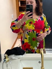 I didn’t end up wearing this but it would be a cute dress for the right occasion. If larger chested might have some issues with the top. I also wasn’t crazy about where the sleeves hit on my arm. Plenty of room in bodice at 27 weeks pregnant, 175lbs.