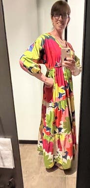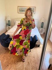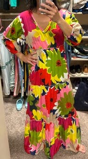 I think I got this in one size too large! It’s a great pattern, really colorful and fun. But it seemed unflattering bc there was so much material! I didn’t end up wearing it outside the house.