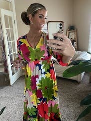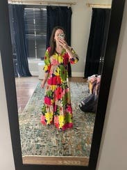 This was such a flattering dress to wear out. Lightweight material and bright pattern made it perfect for hot outside event.