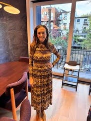 pairs well with tall boots or clogs, wine-colored wrap/scarf and gold jewelry. Lots of compliments. Easy to wear and accessorize!