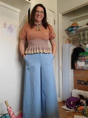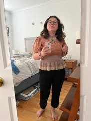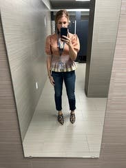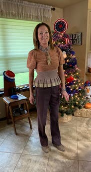 Wore this to work with the faux leather pants. A bit snug on bust, works for slim hourglass.one of those shirts that you're not sure if you love it; did get compliments though! Fun neck detail and original styling; good for creative work.