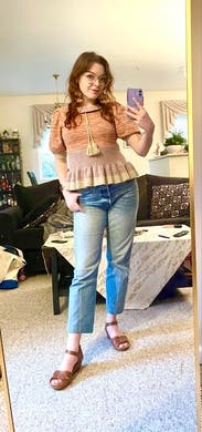 I wasn't totally sure about this when I rented it but, I will say that it is super cute, unique and a really pretty neutral color combo; the sweater material isn't super thick which to me was a plus. And it looked real cute with my wider leg jeans. I thought this might be a little 'doll' looking at first but, it was totally not when it was on. I love the high neck on it, although you can wear it folded down too I believe.