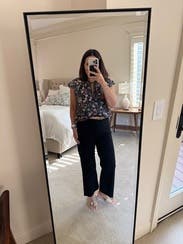 This was a great blouse for transitional fall weather. It is extremely thin fabric and I felt like the neck was a little odd but it did make for a cute outfit.