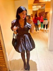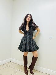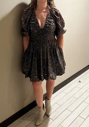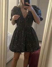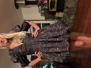 A great party dress. It's a very dark color but the swirly print and bubble hem still read fun enough for NYE. Wore with forest green tights and platforms and got complements all night.