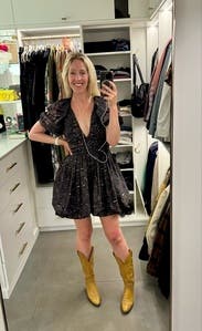 I nearly sent this dress right back without trying it on because the material is so weird. But don’t let that stop you. It’s such a fun party dress. It has a puff skirt and fun sleeves. The fit is normal Ulla. The bodice and neck line are flattering. Such a fun dress to wear and I had so many compliments.
