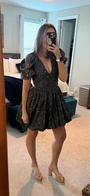 Got so many compliments on this dress even from my platonic finance bro friends. The material is a little plastic-y and I would hesitate to rent this for a hot and humid event but was so fun for a concert and also a birthday dinner. Good pockets and the elastic arm band wasn’t too tight at all!