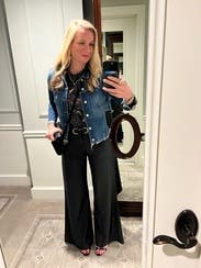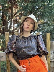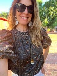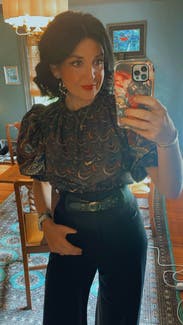 I do love a big puff statement sleeve! While it may be too much for some, I love how it balances out my body type. It’s a cool shirt that elevates a pair of jeans. The fabric is a taffeta blend which makes it even more special.