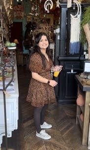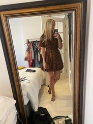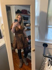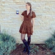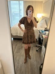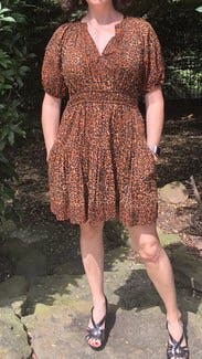 A cute fun dress that's outside my typical rentals. Perfect pattern and colors for fall. The waist was looser than I expected, if I rent again I'll likely size down. Lightweight and easy to dress up or down!