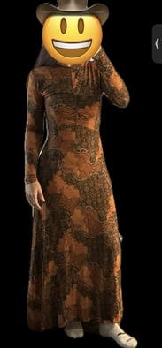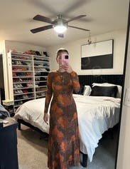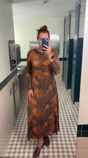 Wanted to bring a little retro inspired vibes to work for our Thanksgiving potluck and this dress was perfect. Did not expect to get as many compliments as I did. If I felt I’d wear more than a few times a year, I’d definitely buy it. It was so soft and comfortable. You can fix the visual belly pouch issue some of the other reviews mention by pulling it up and tucking it with a belt. I wore a bodysuit underneath because it’s a little sheer.