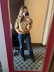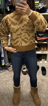 This sweater is cute with jeans. Fabric SUPER itchy. Wore once.