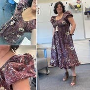 Another wonderful Ulla print. Has pockets. Slightly weighted with embellishment on the hemline which gives structure. A coworker told me I looked like a Disney Princess. Cinched at waist in elastic that was not difficult to breath with. Modest square neckline.