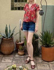 Absolutely loved this top. Super cute tucked into jeans and very versatile. Not too low cut and the puffed sleeves were amazing. Would definitely rent again!