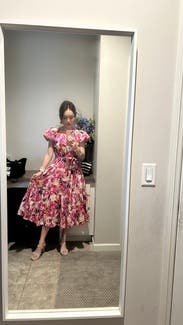Really pretty dress for any sort of garden party or shower. Nice material and really pretty colors. Fit tts and was a great length.