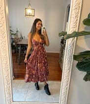 Perfect for a garden/western style wedding on a Texas ranch, paired with ankle boots. The fit was great, I actually wore it without a bra because of the cut. It wasn't too long, so suitable for dancing. Great color scheme and floral print.