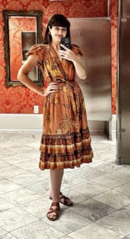 One of my all-time faves. Extremely flattering waistline and nice swishy skirt. I’m busty but the v-neck wasn’t too revealing. Could wear to work on Fridays.