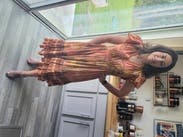 I received many compliments. This design and print is beautiful. It’s flowy and has an adjustable tie belt. I ordered my normal size and had plenty of room left over in the bust and waist. Eye catching and very pretty color in person.