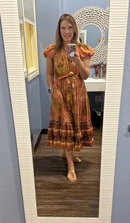 This is a lovely, flowy summer dress with pockets! It runs a touch small overall. I kept wishing I had just a bit more fabric or some stretch. The tie was also odd because there was nothing to keep it in place at the elastic, which is higher than the waist. It just looked odd. But love the top and the sleeves!