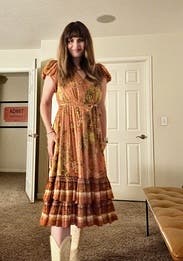 Great lightweight dress with fall colors. Wore to ladies fundraising luncheon with belt and heels in the morning and then to bbq fundraiser with boots later that night.